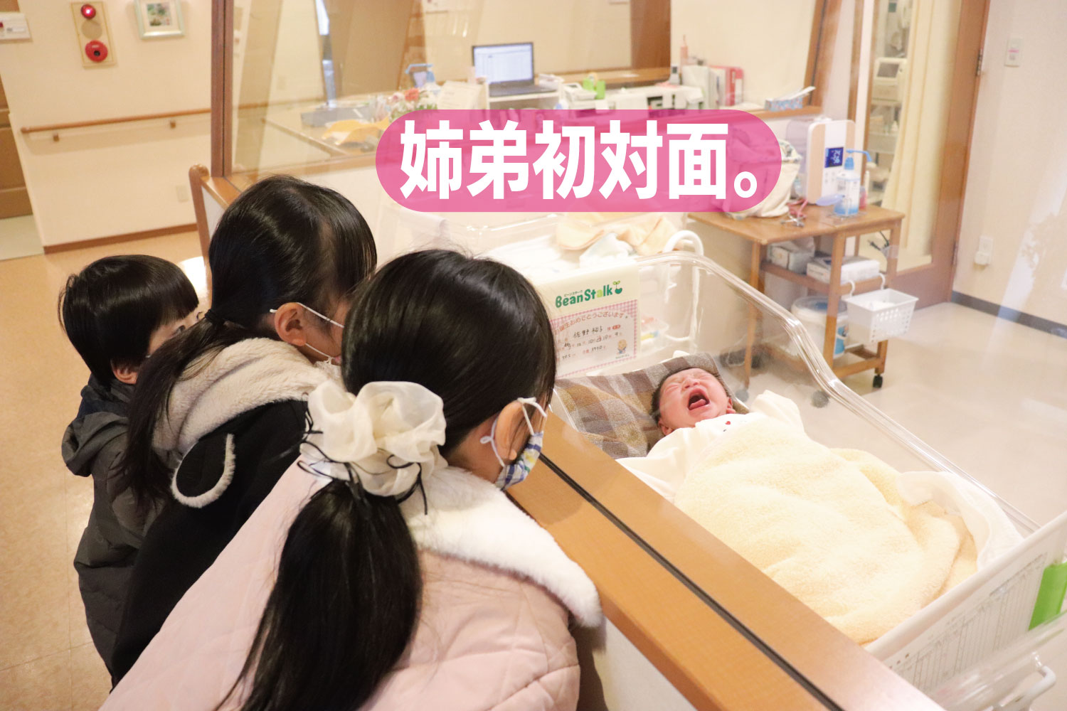 ガラス越しにずっと声をかけ続けるつむぎとひかりときよいち。